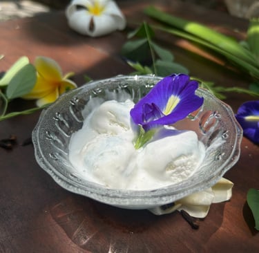 Kombinasi sari bunga telang dan vanilla menciptakan warna biru alami yang cantik dan menenangkan — favorit anak-anak!
